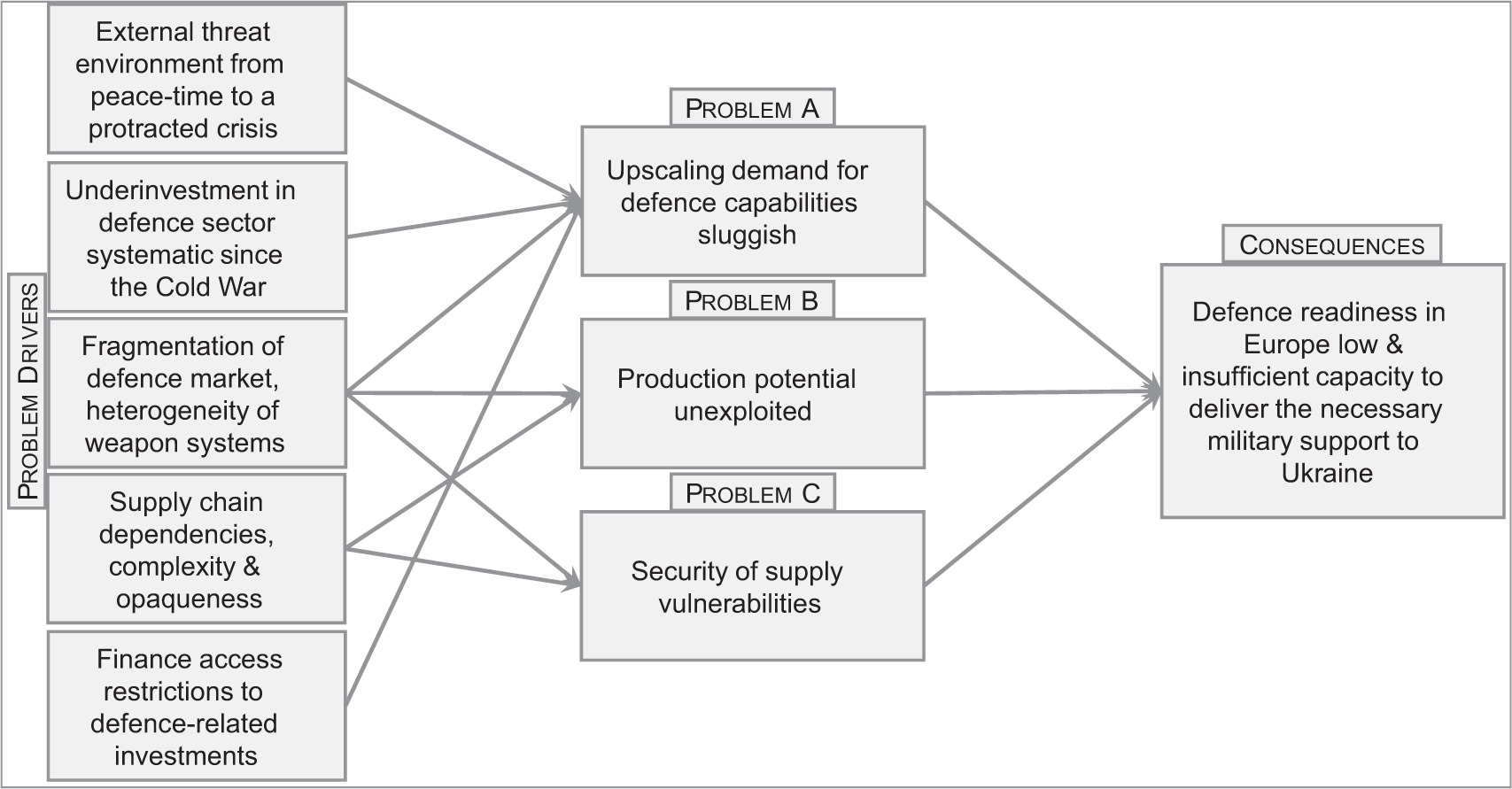 To answer this question in a structured way, this study looks into the key problems, drivers, and consequences of defence capabilities. They are mapped in Figure 1, where three major issues of capabilities at the tactical level are identified: a sluggish upscaling of demand for military equipment, unexploited production potential, and security of supply vulnerabilities.