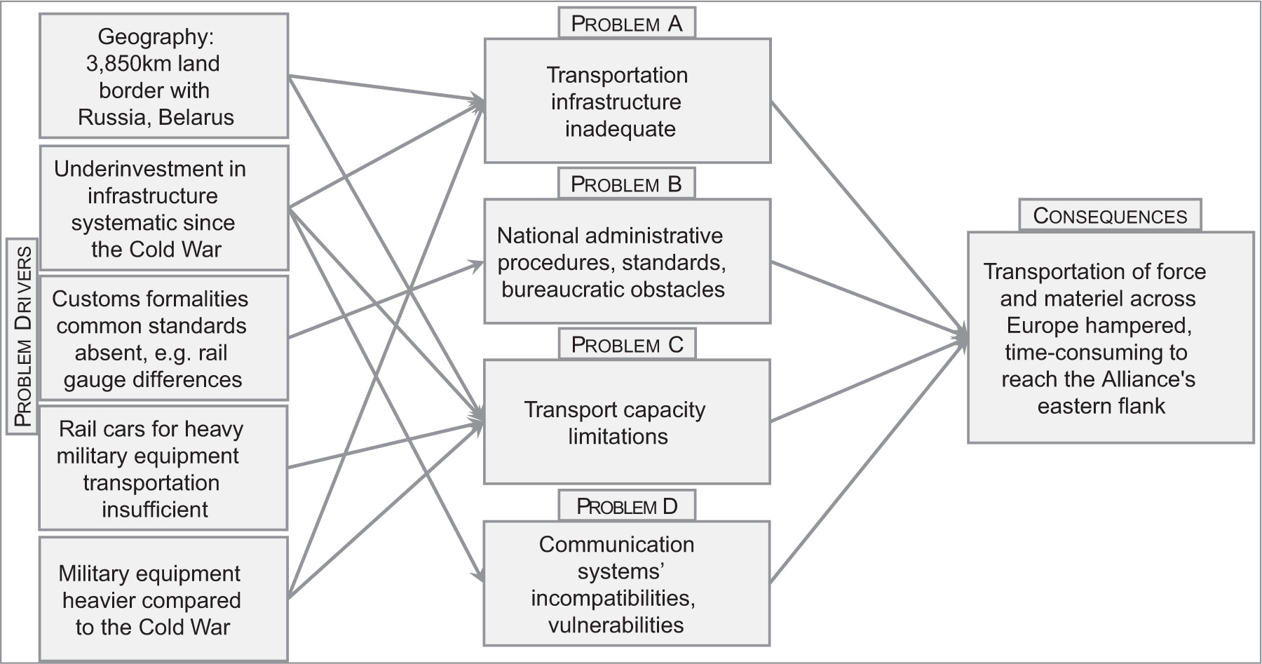 As above, this question is approached in a structured way, and the key problems of military mobility, their drivers, and consequences on defence readiness are identified. They are mapped out in Figure 2, where four major issues of cross-border military mobility in Europe are identified. The main obstacles to a swift force and materiel movement include inadequate infrastructure, including bridges and tunnels, to move armoured military vehicles; lengthy and fragmented bureaucratic procedures, including national regulations and customs requirements as well as administrative processes involved in carrying military materiel across borders; a lack of transport capacity, such as rail cars; and vulnerabilities and incompatibilities in communication systems (Figure 2).
