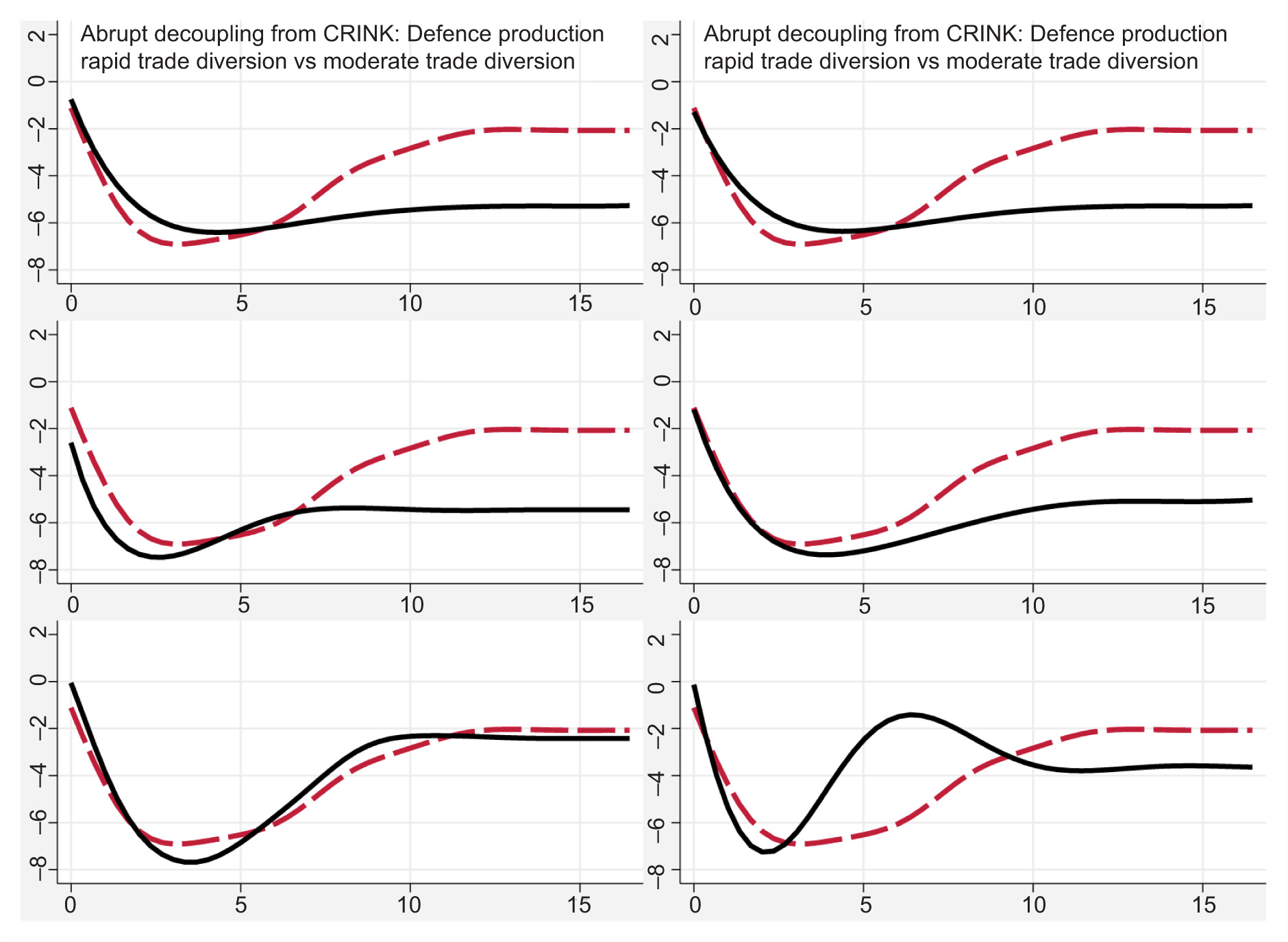 European defence industrial production (% change) following an abrupt decoupling from CRINK. Source: Simulations based on the EU-EMS model.