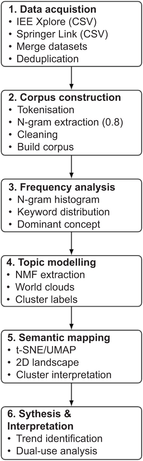 Figure 1 presents a concise overview of the methodological workflow, illustrating how the dataset was systematically processed and transformed throughout the analysis. The diagram summarises the sequential stages of the study, beginning with data acquisition and deduplication, followed by corpus construction, n-gram extraction, and frequency analysis, and continuing through topic modelling and semantic mapping. By visualising these steps in a unified pipeline, the figure clarifies how raw bibliographic records were converted into interpretable thematic structures.