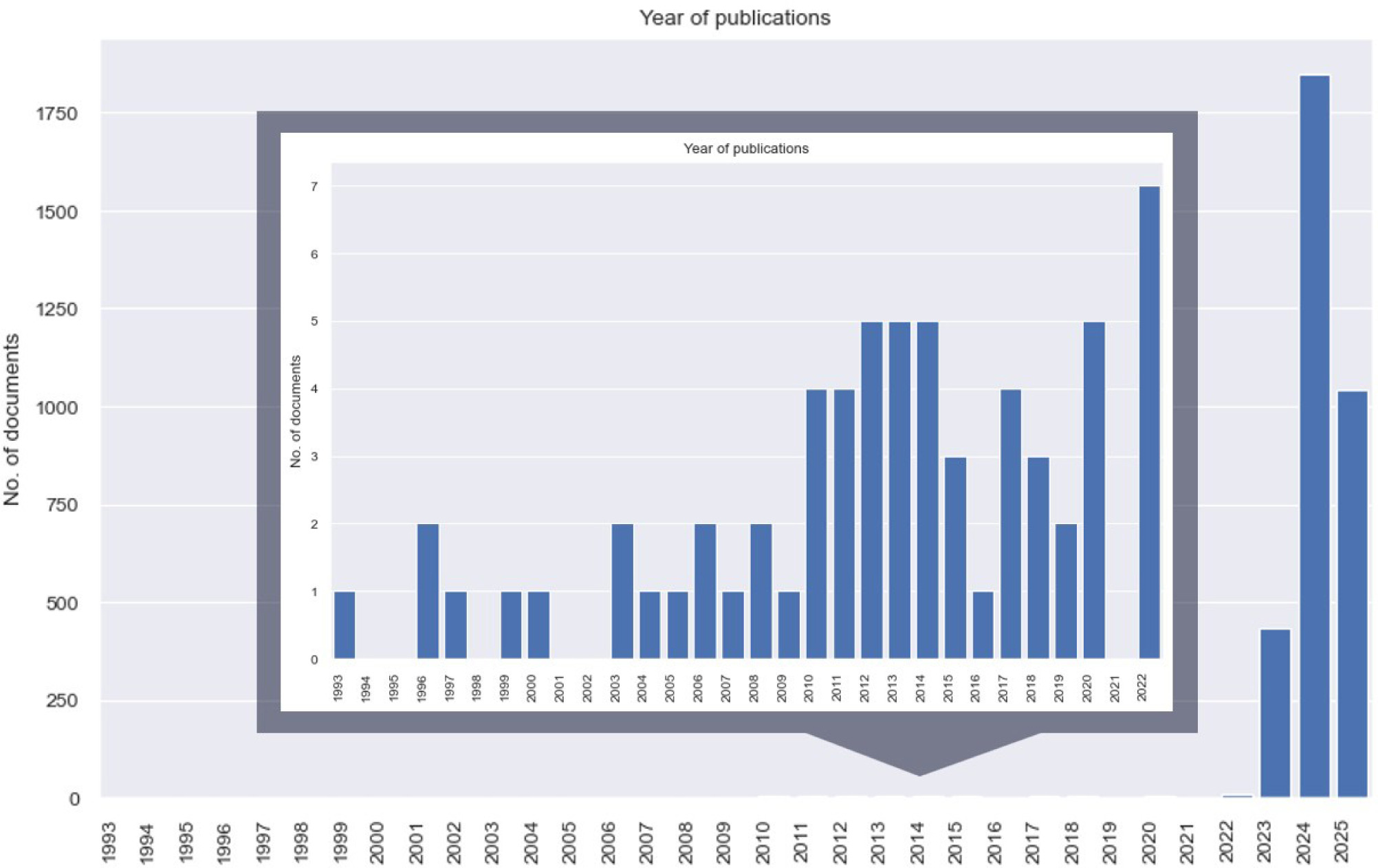 Analysis of the number of publications between 1993 and 2025 (Figure 2) provides a historical baseline for the dataset, illustrating how publication volume evolved over time, enabling the post-2022 surge to be contextualised within a longer trajectory. Starting with one publication in 1993, the number increased slowly until 2022 (seven publications), after which the rate of growth increased significantly. A particularly significant jump was observed between 2022 and 2023, where the number of publications reached 435 per year, only to expand to 1,848 in 2024. Such a growth might indicate not only a increasing interest in the topic of AI in the context of cyber security but also an increased awareness among researchers of the potential defensive and offensive applications of these technologies.