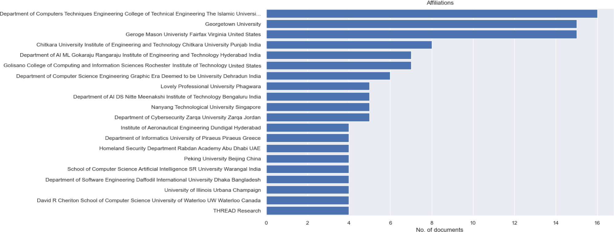 Figure 3 presents the institutional affiliations for publications related to AI and cybersecurity and reveals a diverse set of contributors across academic and research institutions worldwide. Surprisingly, the most frequently occurring affiliation is the Department of Computers Techniques Engineering, College of Technical Engineering, The Islamic University, Najaf, Iraq, contributing sixteen documents to the dataset. This is followed by Georgetown University and George Mason University (Fairfax, VA, USA), each contributing fourteen documents.