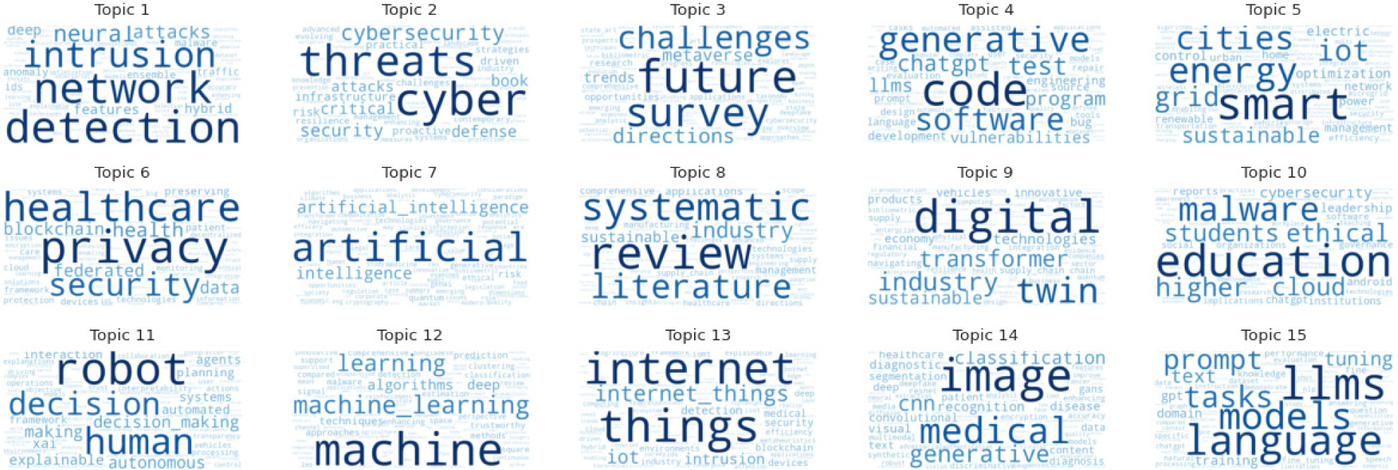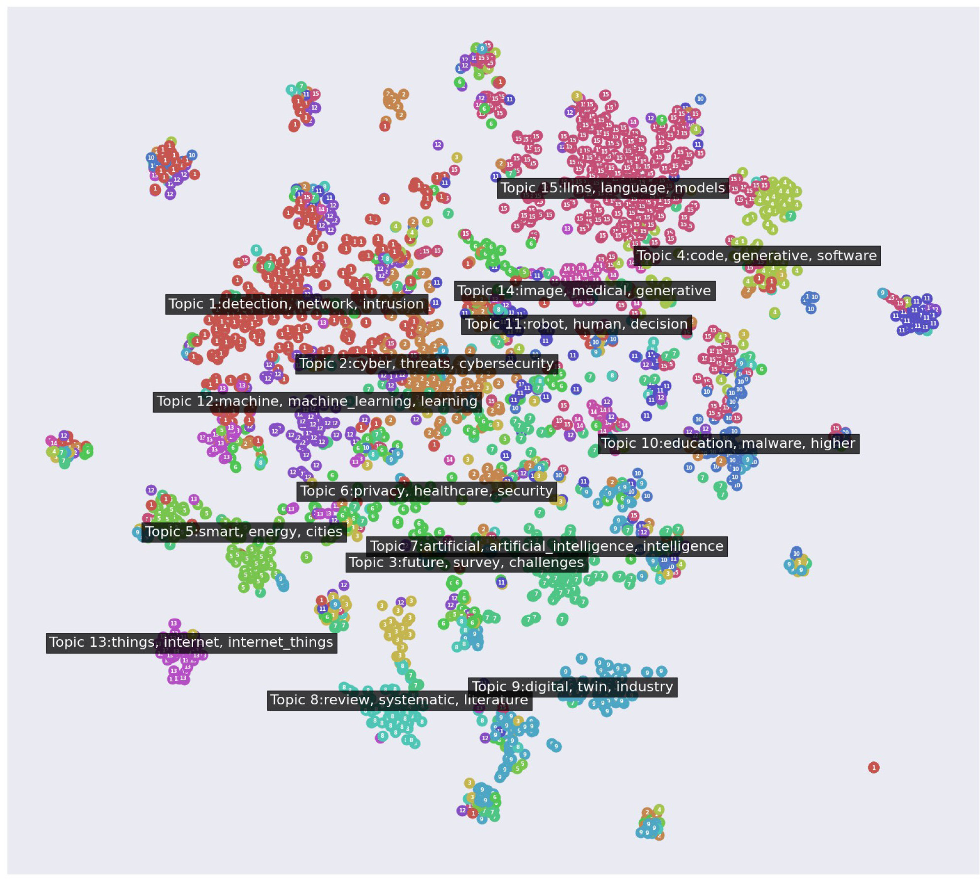 Prominence and connectivity of GenAI themes: Topic 15 (LLMs, language, and models) and Topic 4 (code, software, and generative) are clearly visible as distinct clusters. Their position on the map shows that they are not isolated but are connected to the core cybersecurity detection, network, and intrusion areas. For instance, Topic 15 is situated near Topic 14 (image, medical, and network, often involving artificial neural networks) and is part of a larger super-cluster that includes Topic 4. This indicates a strong established link between generative techniques and broader AI applications.